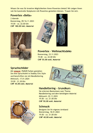 Nebst der fachtechnischen Beratung während ihrem Besuch bei uns bieten wir gut strukturierte und praxisorientierte Kurse für Kinder und Erwachsene an. Das aktuelle Kursprogram steht Ihnen als Download zur Verfügung. Wenn Sie sich für den Besuch eines Kurses entschieden haben, können Sie sich direkt mit dem Anmeldeformular bei uns anmelden. Für Fragen oder weitere Kursvorschläge stehen wir Ihnen natürlich gerne auch persönlich zur Verfügung.